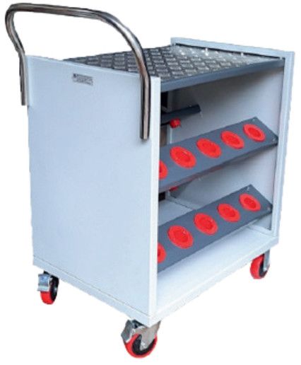 This is the basic model for keeping small quantity of tool holders beside machine with 4 trays - 2 each on either side for keeping tool holders. Aluminium checkered plate at the top for keeping tools and measuring instruments. Tool holders are kept in moulded ABS plastic pocket to avoid metal to metal contact. One stainless steel handle is provided for handling the trolley. Overall dimensions are 760L x 490D x 745H + wheel. 4” castor wheel 2 nos. fixedand 2 nos. swivel with brake is provided. Maximum load bearing capacity is 300 kgs.