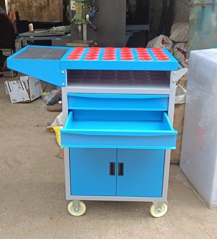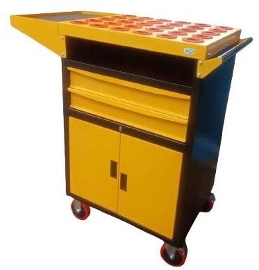 Two plain drawers with aluminium checkered plate is provided at the top for keeping tools and measuring instruments. 4 trays, 2 on each sides for keeping tool holders. Tool holders are kept in moulded ABS plastic pockets avoid metal to metal contact. One stainless steel handle is provided for handling the trolley.